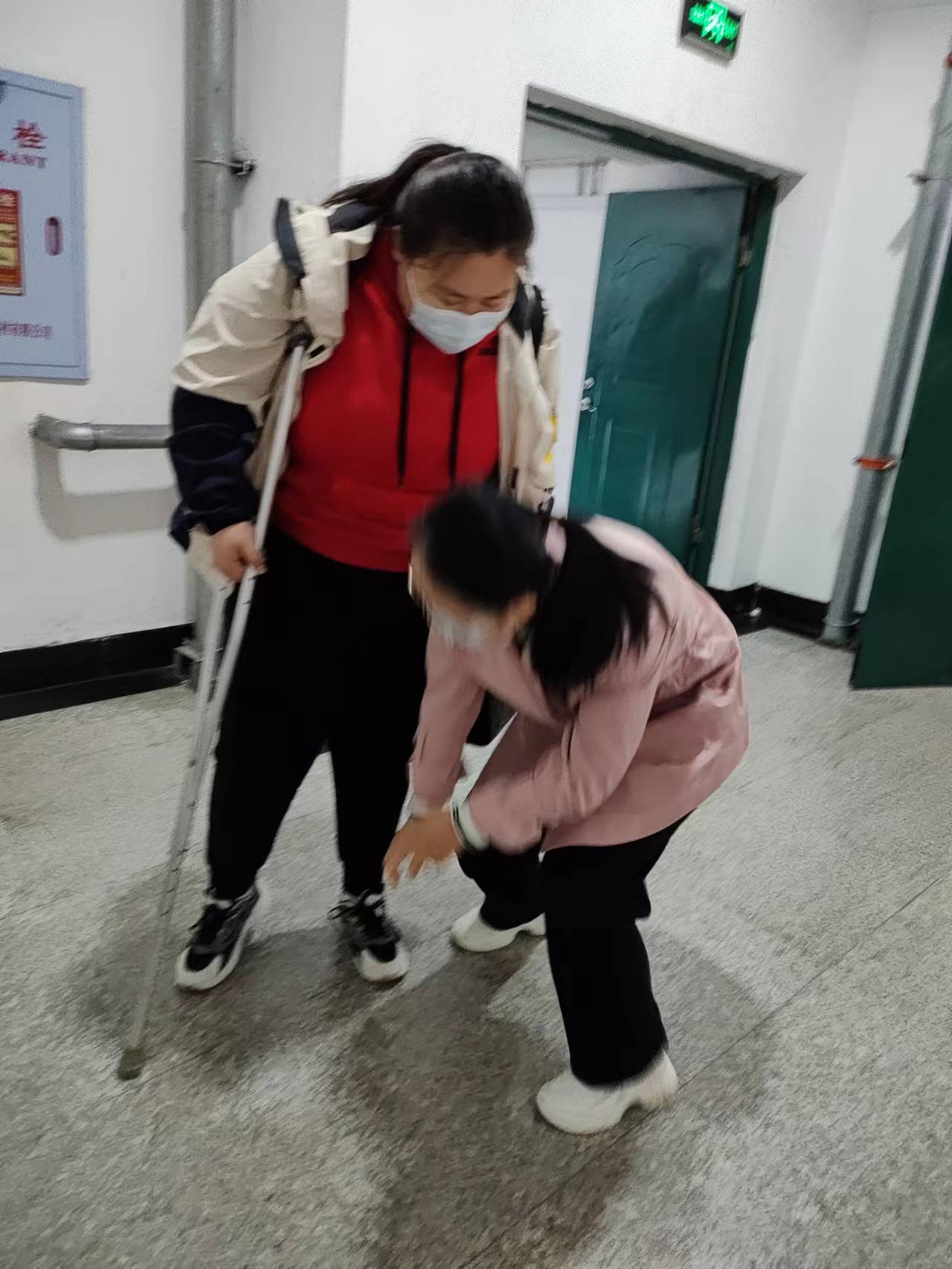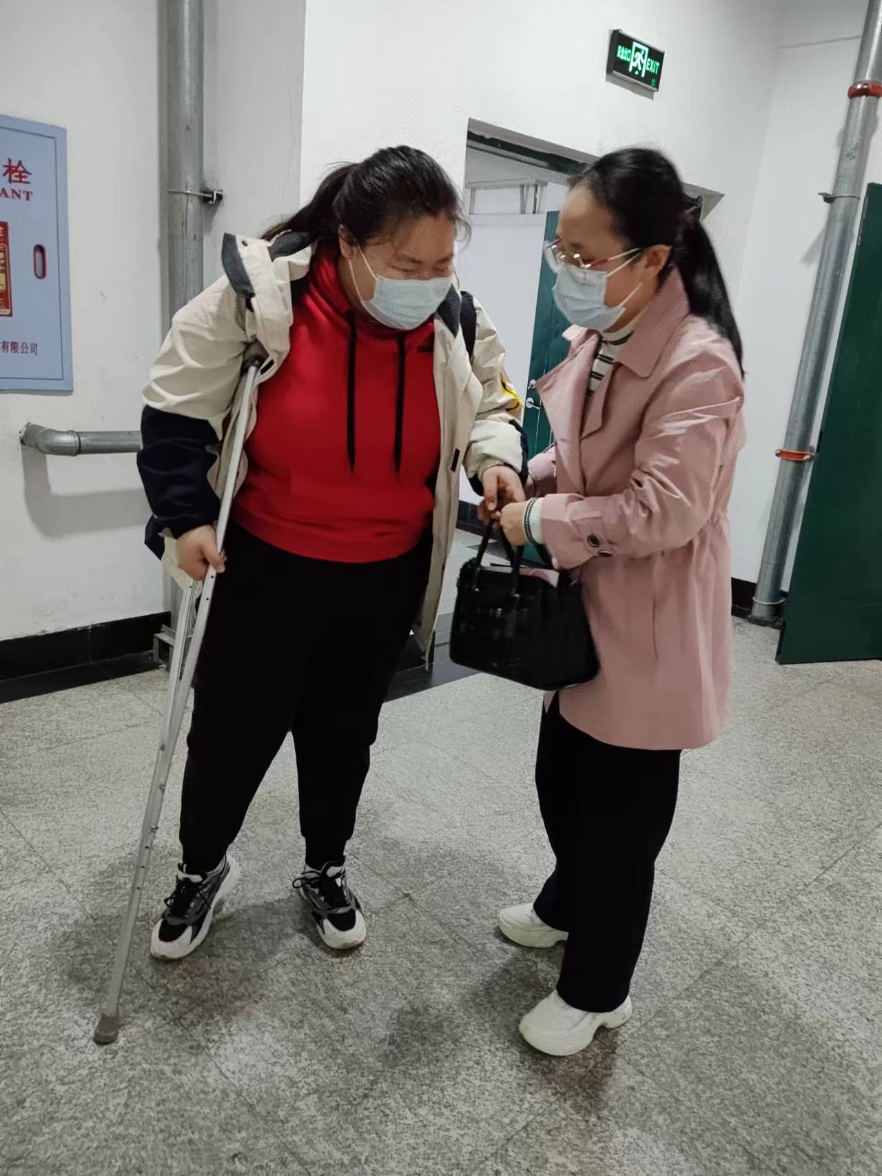 今天(2023年4月24)例行听课,课间见一名同学(22级会计1班 李翔宇同学)拄拐走路,很是困难,马克思主义学院任课教师、共产党员李阳老师主动帮助该同学上下台阶,并组织另外一名同学到电梯口开电梯。