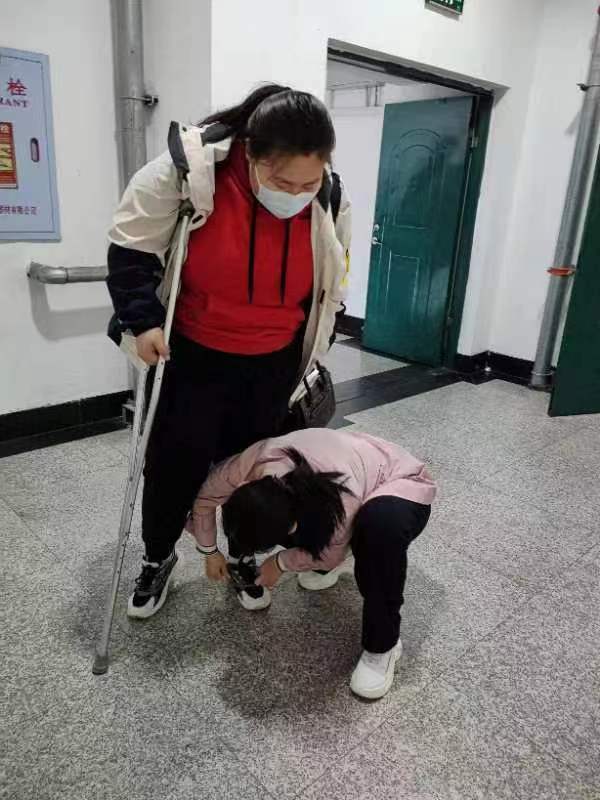 当我问及此事,李阳老师说:“翔宇同学不小心摔伤了,她平时学习很刻苦,上课都坐在第一排,因为生病,自己比其它同学还早起,上课从来没迟到过,现在克服病痛,坚持上课,很令我感动,我只是尽可能的帮一下,如果不是您在这里,我今天会对他还有一些相应的关照,比如说系鞋带,因为您在,我不好意思,怕有作秀的嫌疑……"说话间,李老师感到很不好意思。我赶紧说:“不要因为我影响了你们正常的交流,该有的项目应该有。"