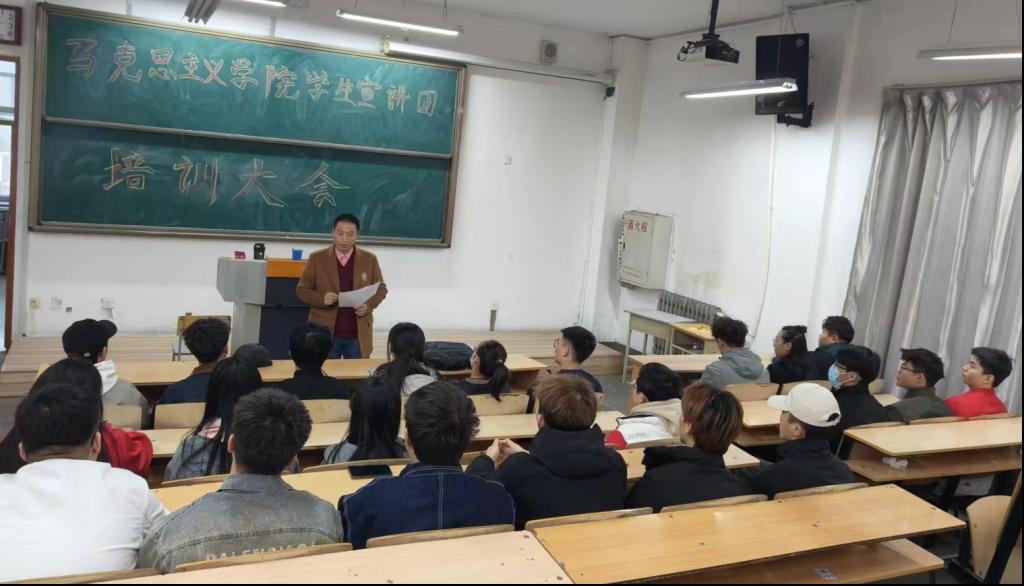为深入学习贯彻习近平新时代中国特色社会主义思想,发挥理论宣讲凝心聚气作用,彰显新时代青年大学生的担当作为,推动党的创新理论入脑入心,在学工处院团委的大力协助下,马克思主义学院学生宣讲团于4月9日召开培训大会,党总支书记程刚到会指导并作培训。