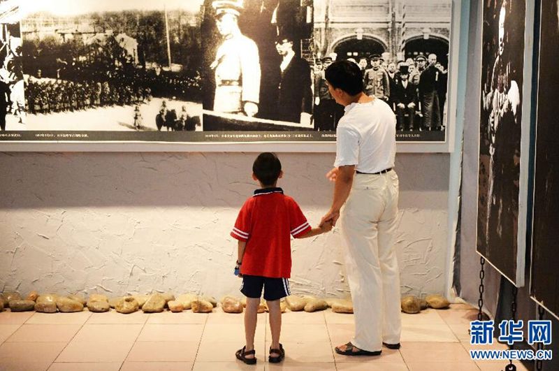 7月7日,一位市民在东北烈士纪念馆内给孩子讲解东北抗战的历史
