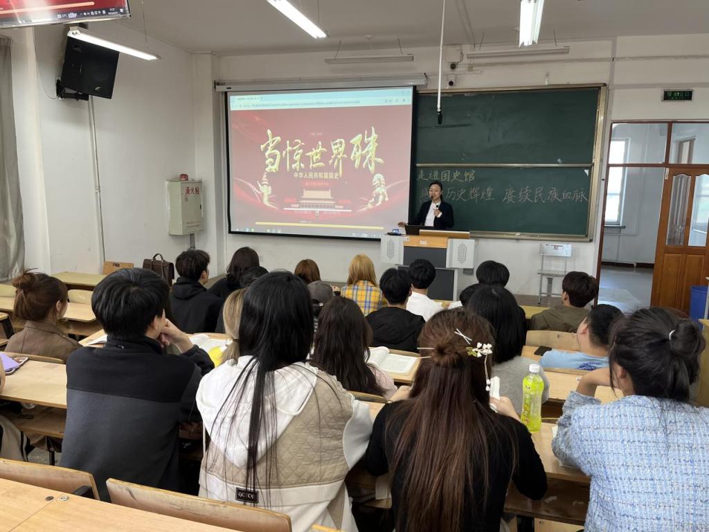 在参观活动中,孟雷老师带领学生们学习了国史馆的第一部分“旭日东升巨龙苏醒”,讲解了中国人民从此站立起来了、社会改革全面展开、经济战场的较量、对外关系的初建、抗美援朝保家卫国等内容。为学生们展现出新中国成立后,以毛泽东同志为主要代表的中国共产党人,团结带领全国各族人民进行社会主义革命,确立社会主义基本制度,对适合中国国情的社会主义道路进行艰辛探索,实现中华民族有史以来最为广泛、最为深刻的社会变革,为当代中国一切发展进步奠定了根本政治前提和制度基础,为新的历史时期开创有中国特色社会主义提供了宝贵经验、理论准备和物质基础。