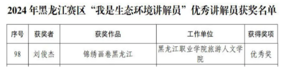 为深入贯彻落实习近平生态文明思想,推动全民生态环境科学素质全面提升,生态环境部组织开展2024 年“我是生态环境讲解员”活动。近日,由省生态环境厅、省教育厅和省科协联合开展的2024年黑龙江赛区“我是生态环境讲解员”活动收官,经过激烈角逐,必赢马克思主义学院康帅老师指导“初心”小队成员、旅游人文学院学生刘俊杰的原创词曲作品《锦绣画卷黑龙江》获得黑龙江赛区“我是生态环境讲解员”优秀奖。