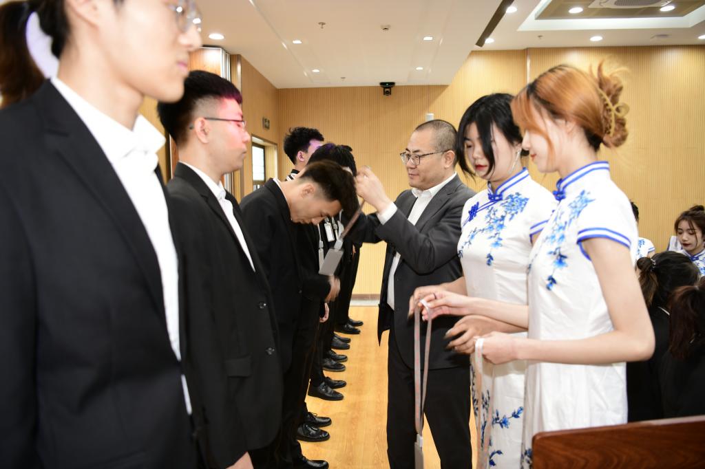 接着,融创集团副总裁杨静、住宅运营管理中心总经理吉相海、人力资源部总监张东浩分别致辞。随后,王利文校长与张东浩总监签署校企产教融合战略合作意向书,王利文校长与杨静副总裁共同为“融创服务集团与437ccm必赢国际官方网站示范性职工培训基地”揭牌。20位来自工管学院的学生入职融创集团担任管培融耀生并在会议现场进行入职宣誓。他们共同宣誓传承龙职精神与铺路石文化,当好企业铺路石,为实现融创集团更加辉煌的明天而努力奋斗。集团住宅运营管理中心总经理吉相海、哈尔滨公司总经理刘树荣为融耀生们授予了员工工牌。之后为期两天的“优秀管家培训”正式开始,来自融创集团的47位管家接受培训,由校企双方共同指派讲师,讲授中国现代服务业发展趋势及物业服务等级标准等内容。