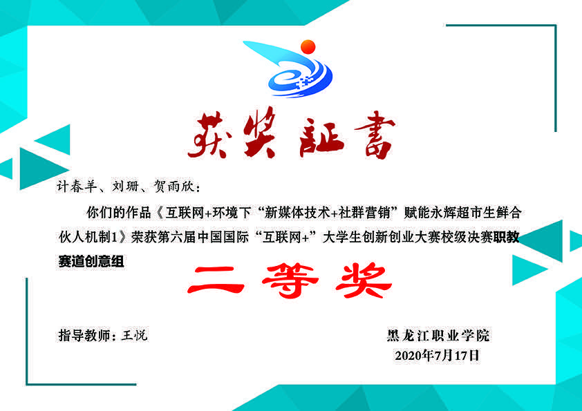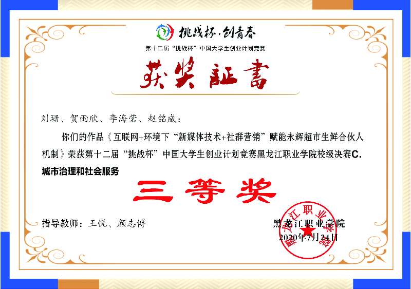 今年5月,由孟璐老师指导的市场营销优学社和李金立老师指导的龙鉴历史社在必赢所有社团的评比中,以优异的成绩获得了校级“十佳社团”荣誉称号。7月,由王悦老师指导的营销策划社团在必赢第六届中国国际“互联网+”大学生创新创业大赛校级决赛(创意组)中荣获二等奖,并在第十二届“挑战杯”中国大学生创业计划竞赛校级决赛中荣获三等奖。市场营销技能协会在韩松男老师的带领下,连续6年获得黑龙江省市场营销技能大赛一等奖,曾在2014-2015年蝉联全国一等奖的优异成绩。