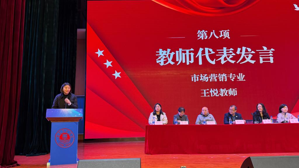 教师代表市场营销专业教研室主任王悦发言说,“做主动的探索者”。“敢迈出第一步”比“标准答案”更有价值,每一次小小的尝试、每一次细微的探索,都是在为未来的职业道路铺垫基石。“做扎实的学习者”。沉下心来学好专业核心知识,筑牢理论根基,让自己的知识体系经得起推敲;也能主动拥抱数字技能,学习那些能为商贸领域赋能的实用工具,努力成长为“懂商贸逻辑、通数字技术”的复合型人才。“做温暖的同行者”。希望大家能主动打开心扉,在团队合作中学会倾听与包容,在集体活动中收获真挚的友谊;遇到难题时,别怕向同学伸出援手,也别犹豫向老师寻求帮助——数字商贸学院是一个温暖的大家庭,我们会始终站在你们身后,为你们的成长保驾护航。