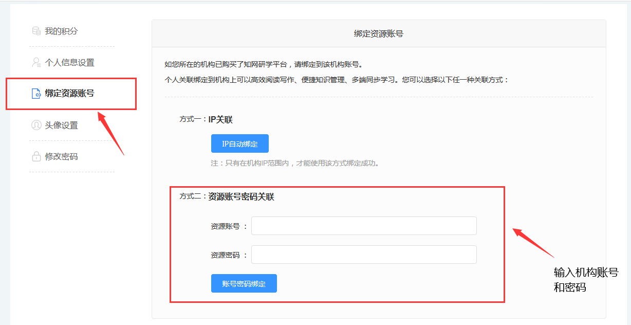 点击研学平台网址:x.cnki.net ,登录个人账号和密码成功后,可以绑定机构账户,研学平台的账号为:hljzyxy 密码为: hzxy 。