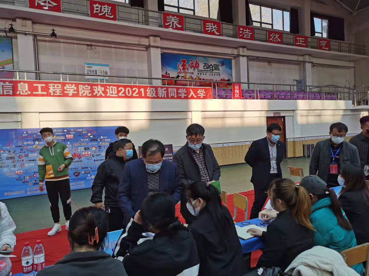 为了进一步落实好迎新相关工作,信息工程学院党委书记王文焕、院长金忠伟及各教研室主任来到迎新现场检查指导工作,看望报到新生,了解具体情况,慰问在场工作人员,查看实时新生报到数据。