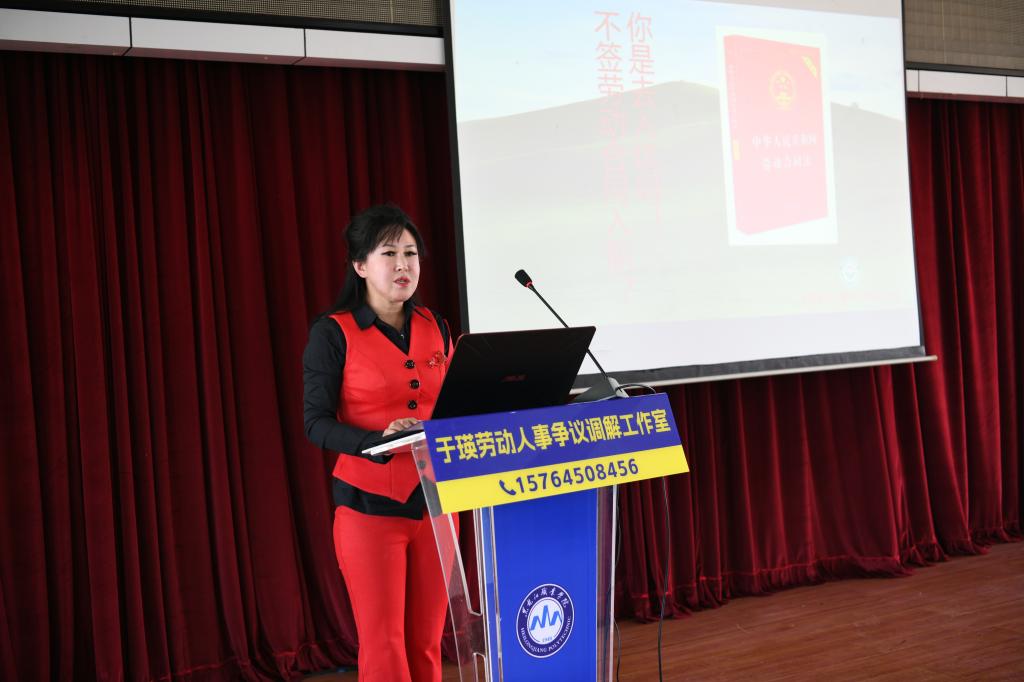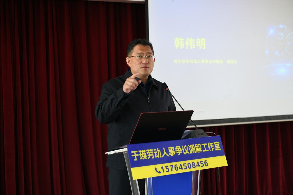 哈尔滨市劳动人事争议仲裁院副院长韩伟明,在致辞中指出,劳动人事争议调解仲裁是劳动者维权的前置程序,将法律宣传延伸至高校,是从源头化解就业矛盾的创新实践,旨在帮助学生提升风险预判能力、掌握依法维权方法。