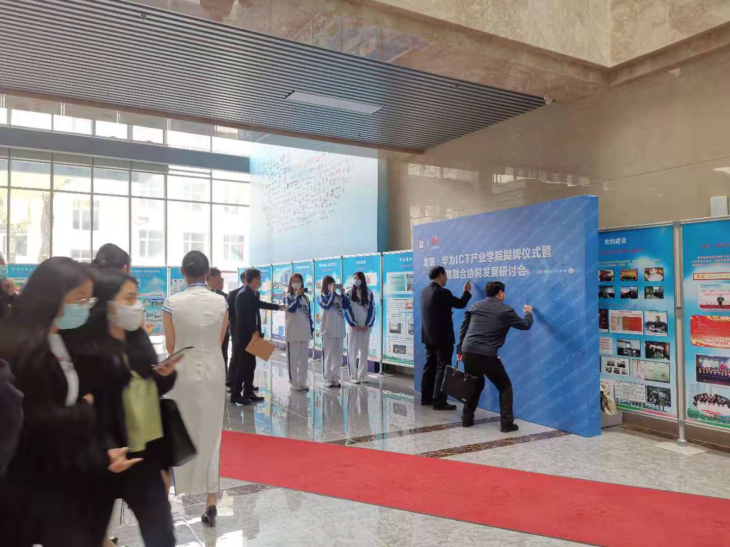 437ccm必赢国际官方网站党委书记赵继会与华为中国政企教育行业副总经理张晓鹏共同为“龙职•华为ICT产业学院”揭牌。437ccm必赢国际官方网站在省教育厅指导下、在工信厅支持下,抢抓机遇。2017年,与华为签约成立了华为信息与网络技术学院;2019年,学校联合深圳职院、重庆电子、山东商业、天津电子等11所院校与华为共同成立了ICT产教融合联盟,致力于产教融合型人才培养;2020年,我们与华为签订了全面深化校企合作协议,共建的内容有11项,其中一项就是共建华为ICT产业学院,我们的目标是创新信息技术人才培养模式,实现“信息技术+X产业”,培养复合型技术技能人才,为龙江产业服务。