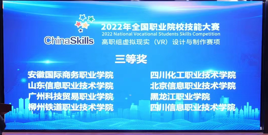 11月12日-13日,由教育部举办的2022年全国职业院校技能大赛(高职组)虚拟现实(VR)设计与制作赛项赛中。来自全国各省市地区的52个代表队经过两天十一个小时的激烈角逐,我院由郭帅老师和张玮宏老师指导的动漫制作技术专业学生单鑫、李博、杨学鹏三名同学喜获团体三等奖。