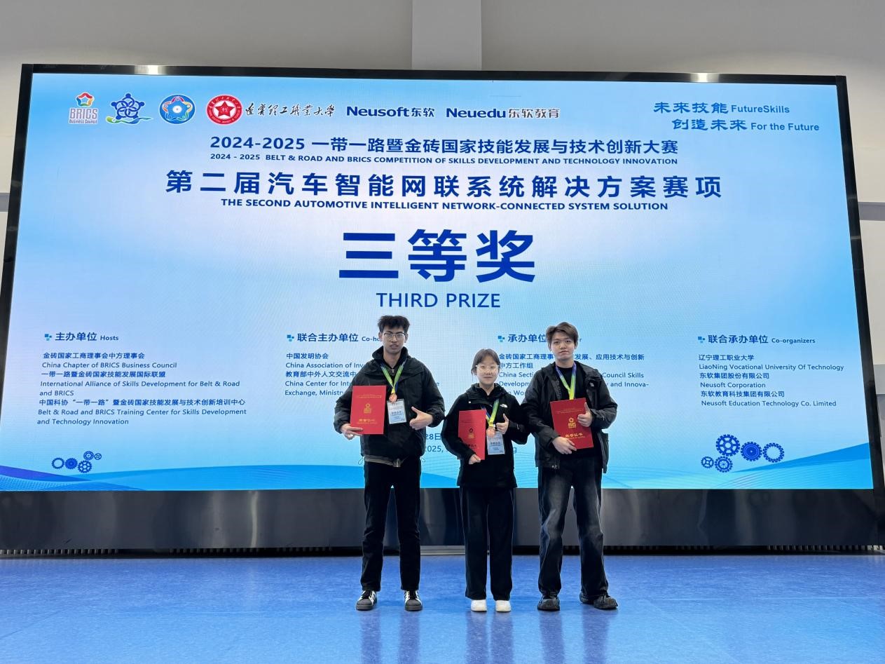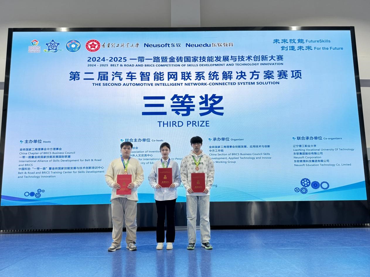 2025年3月28日-29日,2024一带一路暨金砖国家技能发展与技术创新大赛之汽车智能网联系统解决方案赛项国内赛决赛在辽宁理工职业大学隆重举行,来自全国的55支参赛队伍同台竞技,必赢信息工程学院邱志旺、宋志鹏、杨雪以及陈明泽、曹耘赫、丁莹六名学生组成的两个团队,凭借着娴熟的专业技能、良好的心理素质,分别获得三等奖,为学校争得了荣誉。