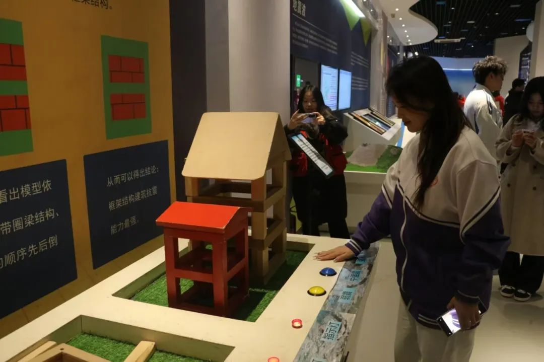 科普馆的讲解员为同学们带来了一场生动的防灾知识讲座,详细介绍了地震、火灾等自然灾害的成因、预防措施及应急处理方法。在科普馆的专业指导下,同学们亲身体验了地震模拟平台,感受了不同震级的地震波动。通过模拟体验,大家更加直观地了解了地震的破坏力,并学习了在地震发生时如何正确避险和逃生。