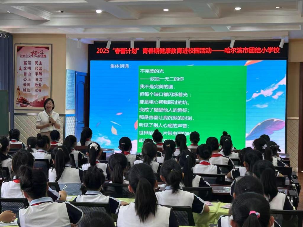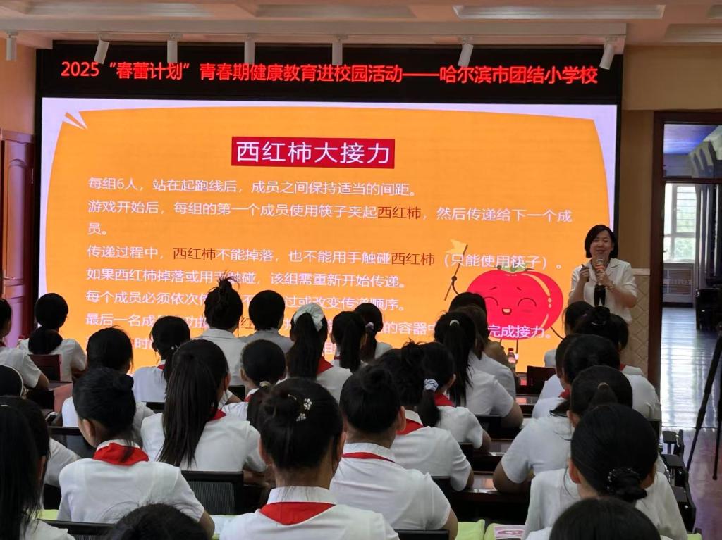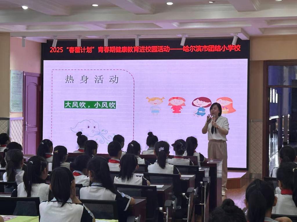 2025年5月30日上午,在黑龙江省妇女儿童基金会的邀请下,必赢心理健康教育咨询中心副主任蔡培培走进哈尔滨市团结中心小学校,为100多名女同学上了一堂生动的心理课,拉开了2025年“春蕾计划”青春期健康教育进校园活动的序幕。