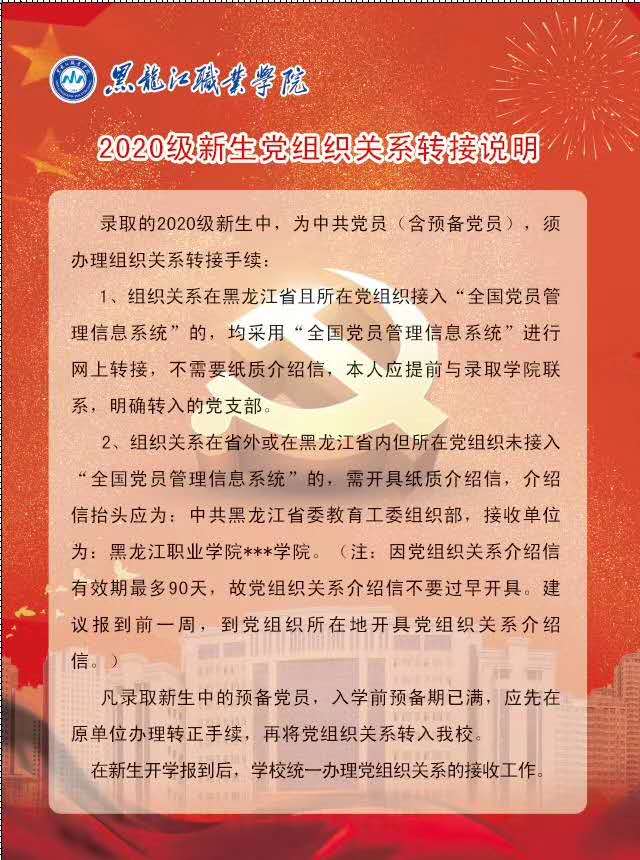 2、组织关系在省外或在黑龙江省内但所在党组织未接入“全国党员管理信息系统”的,需开具纸质介绍信,介绍信抬头应为:中共黑龙江省委教育工委组织部,接收单位为:437ccm必赢国际官方网站***学院。(注:因党组织关系介绍信有效期最多90天,故党组织关系介绍信不要过早开具。建议报到前一周,到党组织所在地开具党组织关系介绍信。)