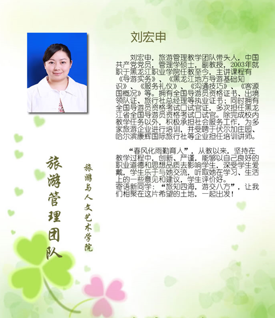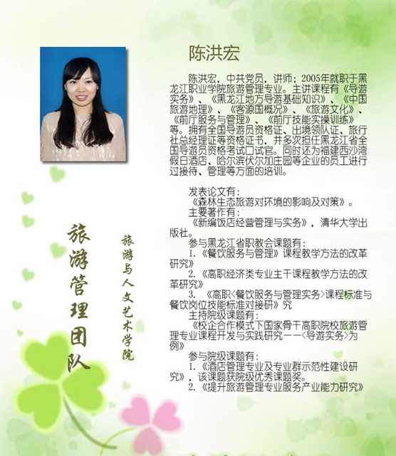 旅游管理专业教师平均年龄不足40岁,是一支整体素质高、改革意识强、师德高尚、有较高教学水平以及较强实践能力的教师队伍。经过10余年的建设,旅游管理教学团队与企业深层合作,建立了一支职称、年龄、学历结构合理、数量足够,技术研究、开发、推广及为社会技能培训、服务等开展良好,效益明显的专兼职教师团队。(附主要教师介绍:刘宏申、陈洪宏、于成龙、王伟、诸贤女)